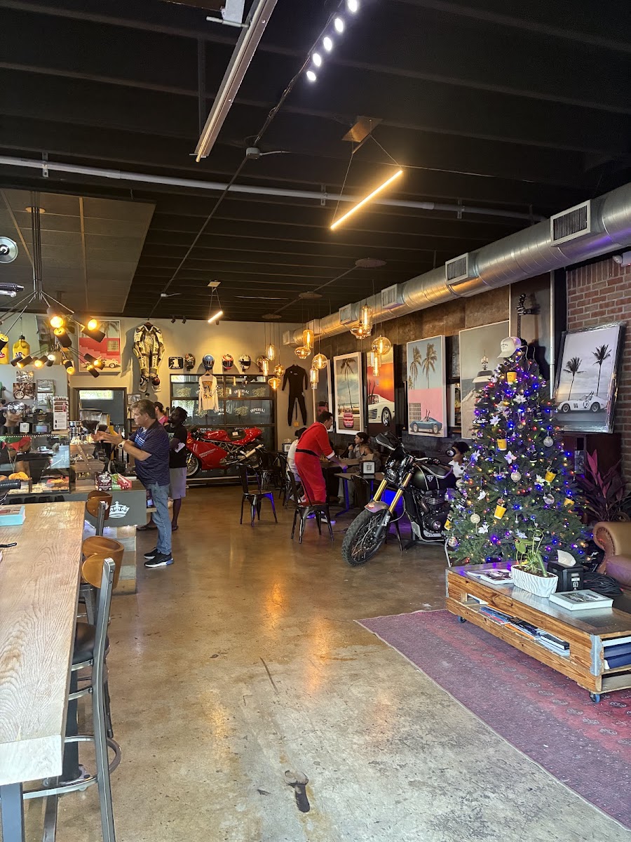 This was on our list of places to check out for a while, so we were excited to finally have the chance to go. Imperial moto is a neat and interesting cafe, especially for motorcycle and car enthusiasts. There's something neat to discover in every nook and cranny. They also sell themed merchandise, and motorcycles are on display. The patio out front is a peaceful oasis, and theres plenty of vehicle related magazines to enjoy. The menu is a little on the small side, but we found a few options. The salmon toast was tasty and well balanced. The letdown was the coffee. We ordered 3 coffee drinks. 2 were the worst coffee we've ever had, and one was slightly better. It's a neat cafe, but I can't picture going back.